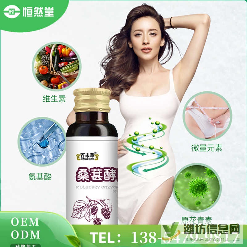 百未草桑葚酵素一件代發現貨供應 OEM貼牌代加工山東恒然堂生物科技有限公司是一家致力于飲品飲料、片劑、粉劑、顆粒、袋泡茶、泡騰片、SC普通食品、特殊膳食、化妝品OEM、ODM 代工貼牌、來樣品加工、來配方加工產品研發、打樣、免費包裝設計、營銷策劃支持隨時參觀工廠基地
